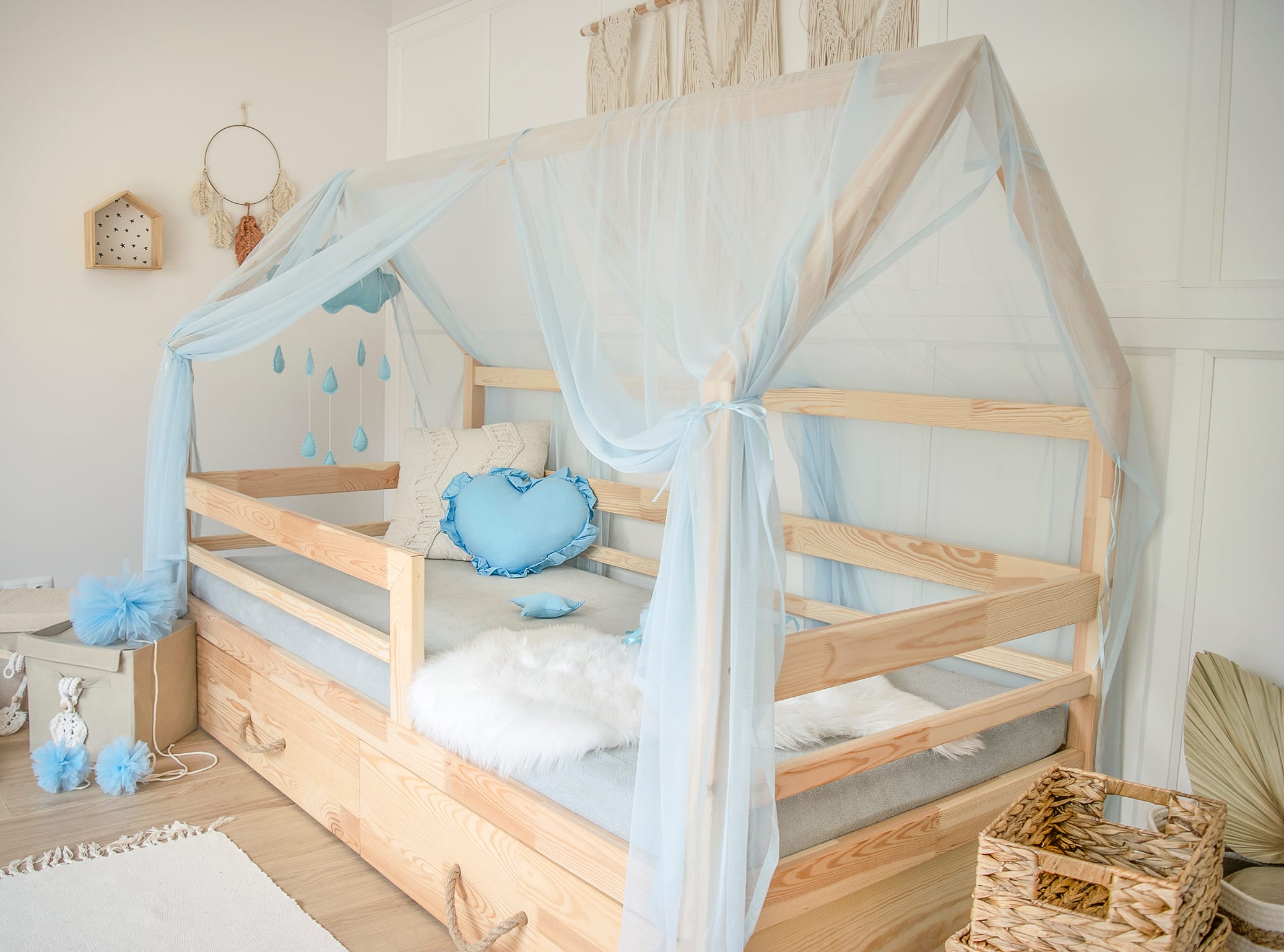 Wyobraź sobie miejsce, które jednocześnie uspokaja, wycisza i zachęca do marzeń. Daszek na łóżko domek od Scandiland sprawia, że zwykłe łóżko zamienia się w bezpieczną przystań, w której dziecko może się wyciszyć po pełnym wrażeń dniu. Tkanina otula konstrukcję łóżka, tworząc subtelne wnętrze przypominające namiot lub domek na drzewie. To wyjątkowy element wystroju, który wpływa nie tylko na estetykę pokoju, ale i komfort dziecka.