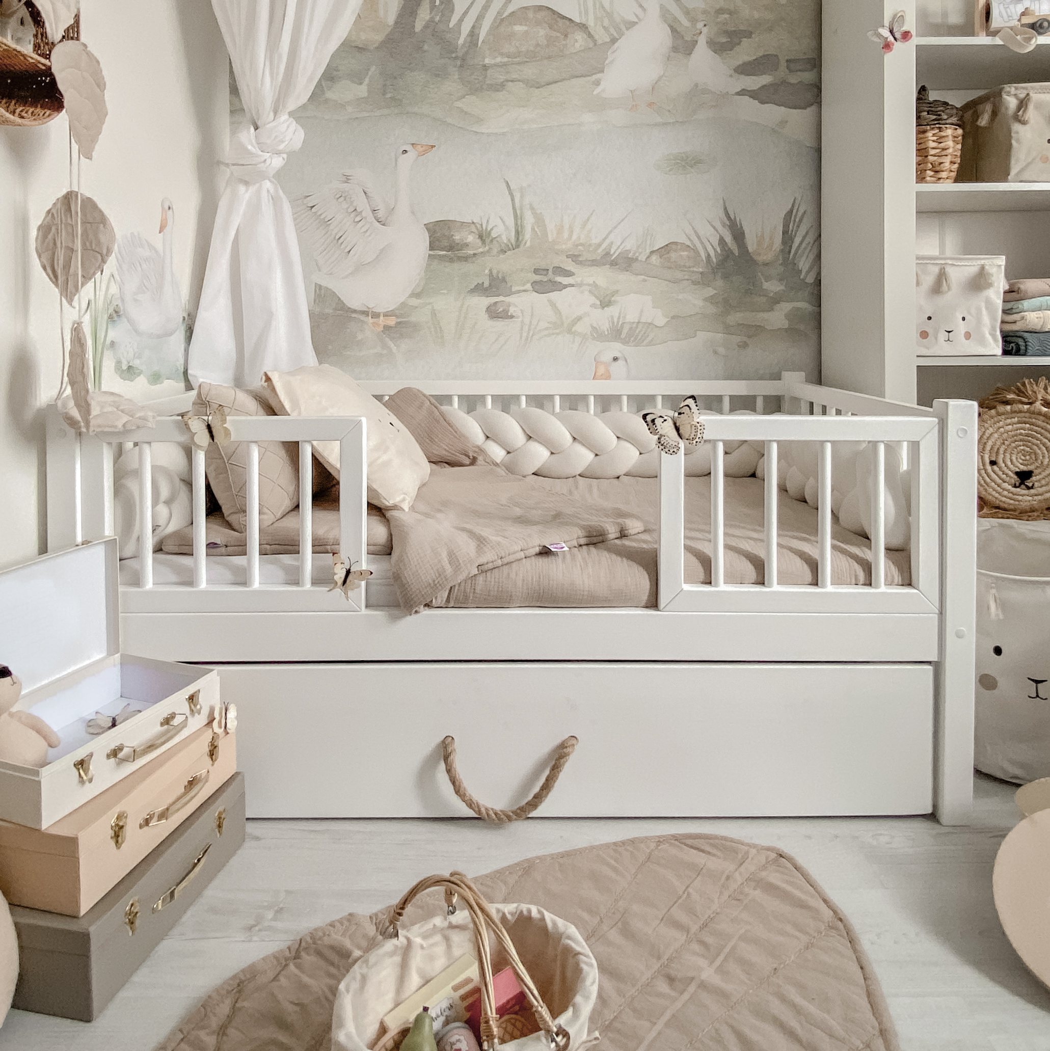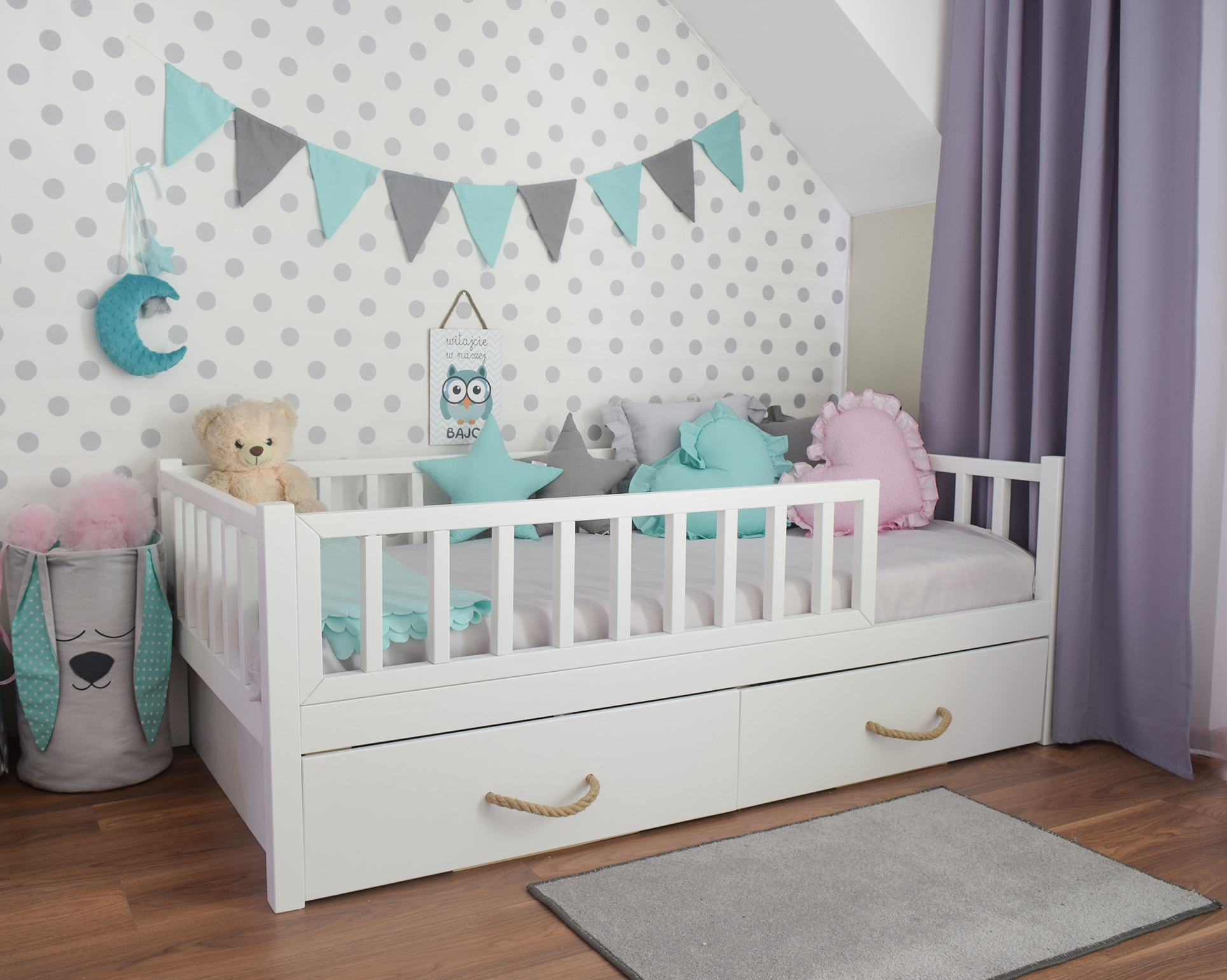 Łóżko Alva 200/90 białe, 2 szuflady- uchwyt frez , barierka przednia 2/3