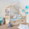 Łóżko domek Bello z szufladą to wysokiej jakości łóżko w stylu skandynawskim -wykonane jest z pierwszej klasy kantówki sosnowej o przekroju 5×5. To wspaniałe miejsce nie tylko dla snu ale i bezpiecznej zabawy dziecka