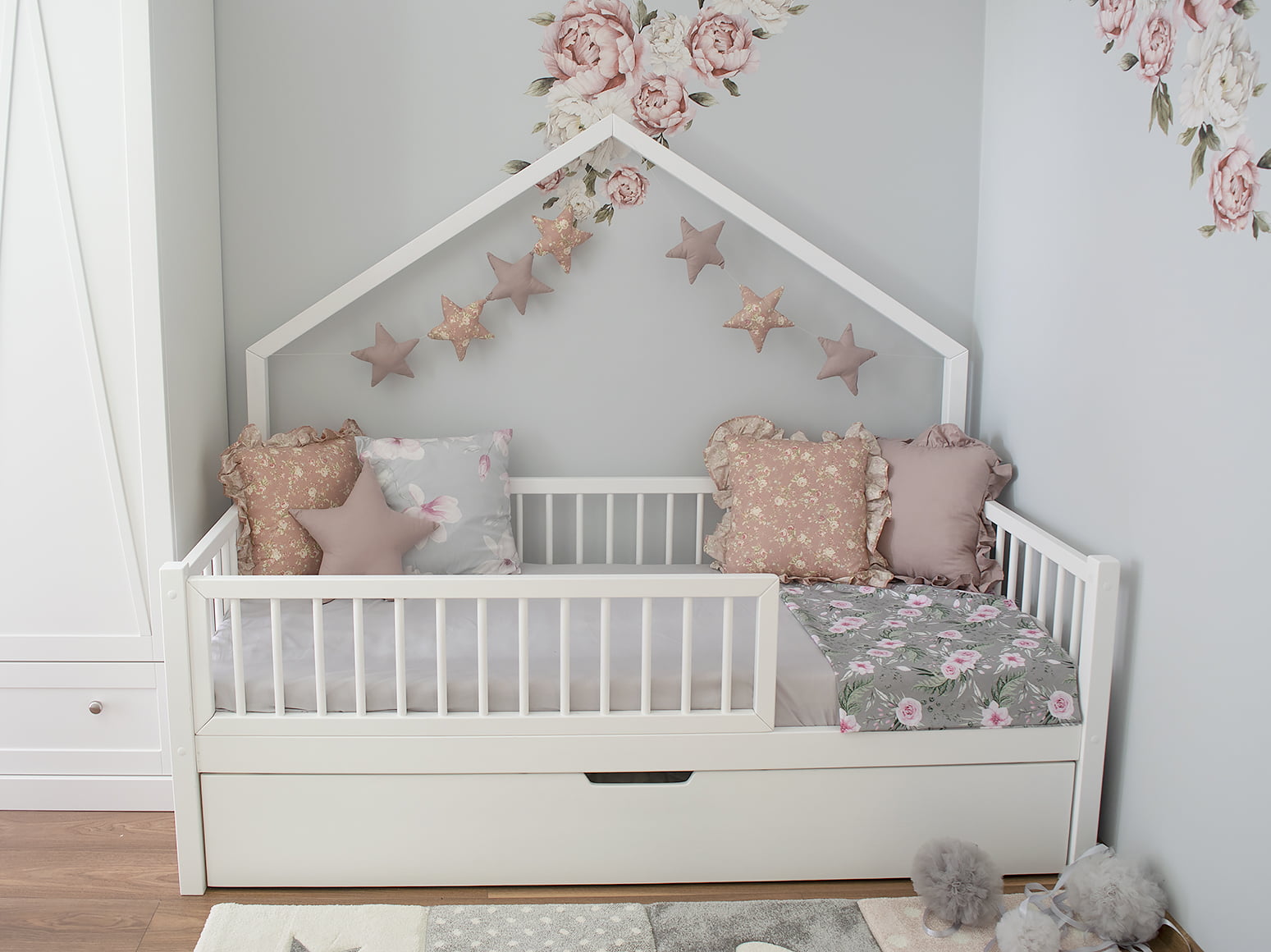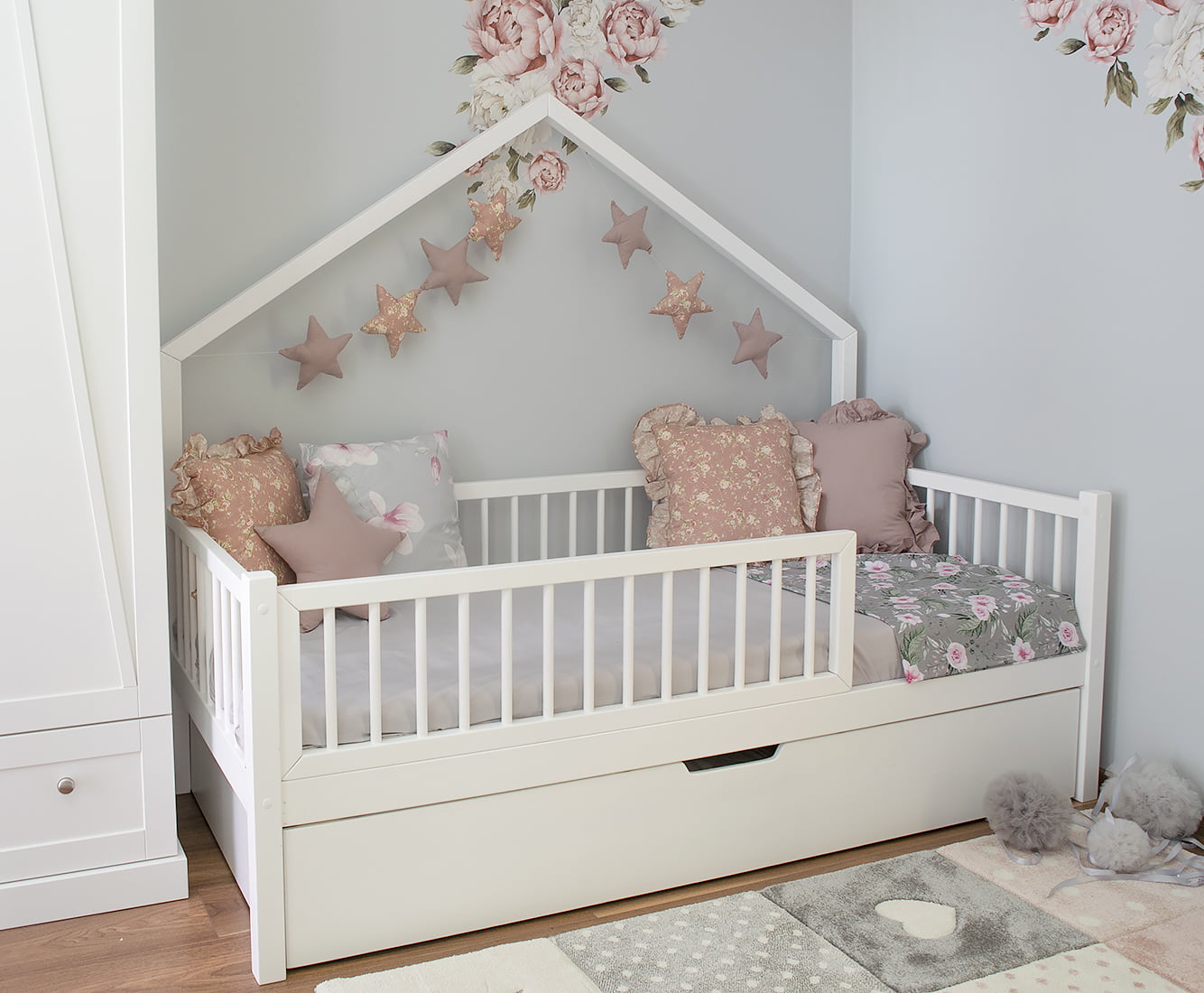 - Łóżeczka drewniane białe, Łóżeczka dziecięce z szufladą, Łóżko dla dziecka z barierką, Łóżko dla dziecka z szufladami, Łóżko dziecięce domek
