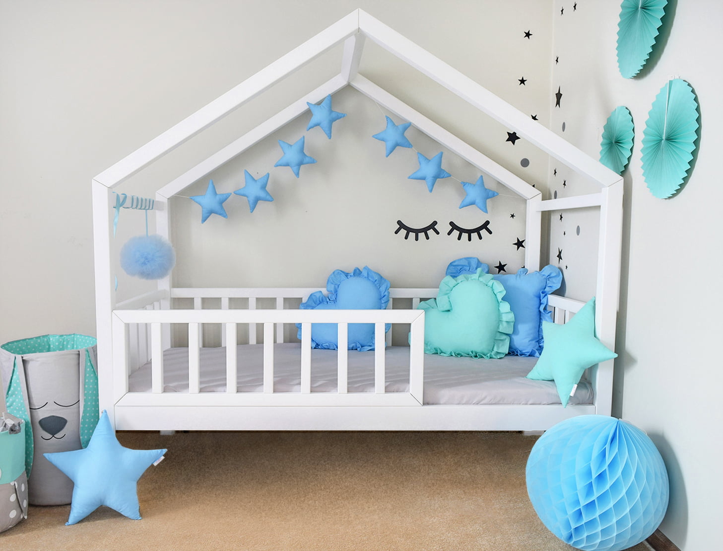 - Łóżeczka drewniane białe, Łóżko dla dziecka z barierką, Łóżko dziecięce domek