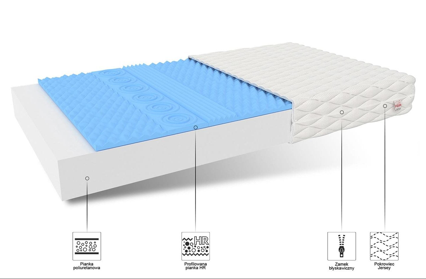 Ponadto zastosowana profilowana pianka HR, wyróżnia się niezwykłą trwałością i odpornością na odkształcenia. Dodatkowym atutem pianki jest jej porowata struktura, która zapewnia doskonałą cyrkulację powietrza, co uniemożliwia rozwój grzybów i pleśni.